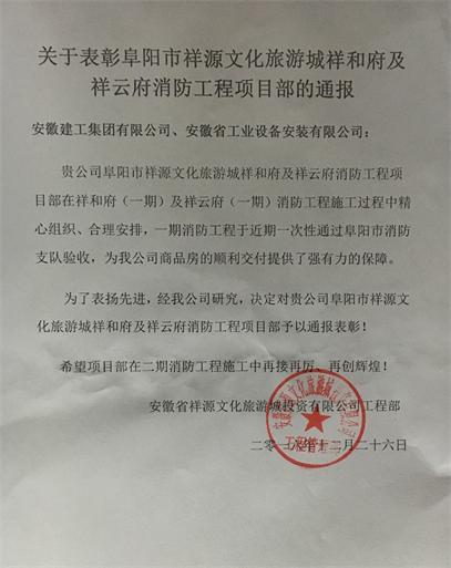 12月26日,阜陽市祥源文化旅游城業主單位安徽祥源文化旅游城投資有限公司發來通報,就公司第四分公司阜陽市祥源文旅城消防工程項目部在一期工程施工中的突出表現給予表彰!