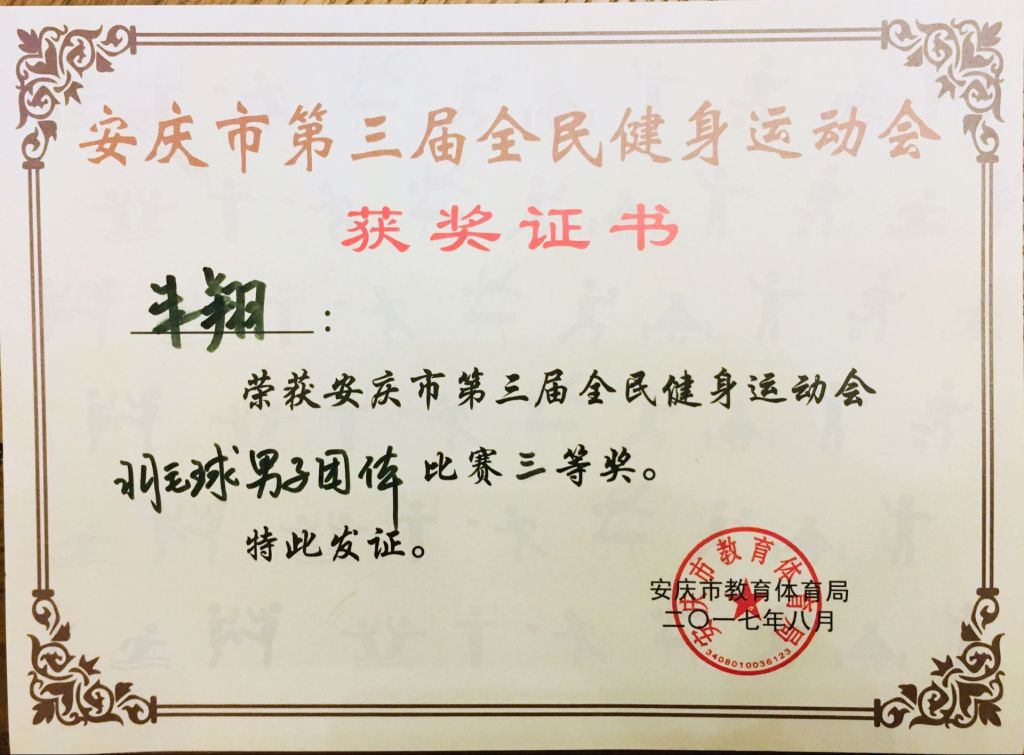 安慶市第三屆全民健身運動會于8月8日正式舉行。安慶分公司朱翔同志代表安徽省工業設備安裝有限公司參加羽毛球項目的比賽,獲得了男子團體三等獎和混雙二等獎的好成績。