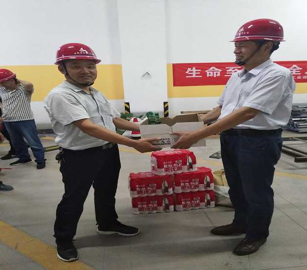 7月23日,第一分公司黨支部書記胡迎東、分管生產(chǎn)副經(jīng)理魯會、分管安全副經(jīng)理李多德、一分公司工會副主席鄭佳及相關(guān)部門負責(zé)人來到省行政中心提升改造項目部,為現(xiàn)場員工發(fā)放了茶葉、礦泉水、花露水等防暑降溫物品,把清涼送到了施工一線,把關(guān)懷送到員工心中!大家紛紛表示:雖然在屋頂露天施工酷熱難耐,但有分公司領(lǐng)導(dǎo)的關(guān)懷,一定能克服高溫環(huán)境帶來的困難,堅守崗位,苦干實干,保質(zhì)保量地按時完成施工任務(wù)。