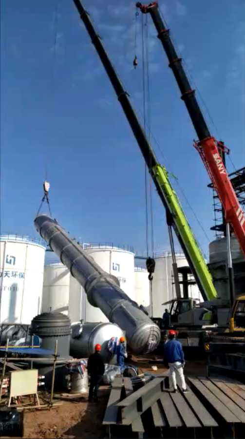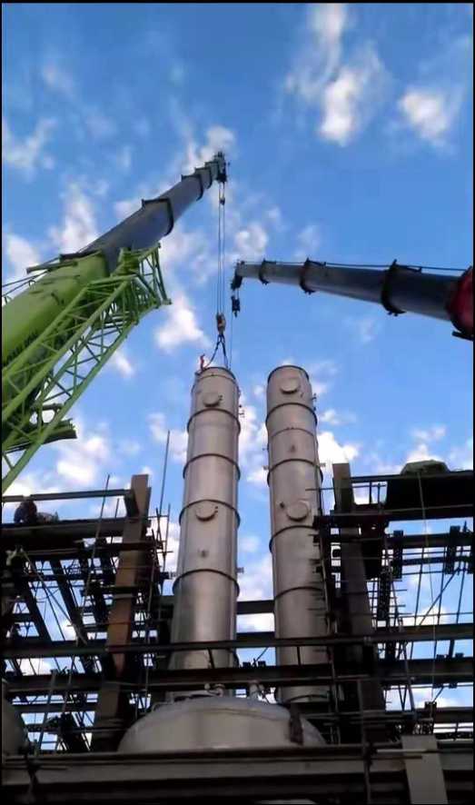此次吊裝任務(wù),輕組份塔重20噸,純苯酐塔重28噸,項(xiàng)目部采用90噸履帶吊車,要求主吊一次性吊裝就位。項(xiàng)目施工難度大、技術(shù)要求高、各環(huán)節(jié)關(guān)聯(lián)密切,給吊裝作業(yè)帶來巨大挑戰(zhàn)。無論是分公司管理人員還是項(xiàng)目部一線工人,大家擰成一股繩,全力以赴投入到吊裝工作中,順利實(shí)現(xiàn)了“每一次吊裝都是承諾”的目標(biāo)。