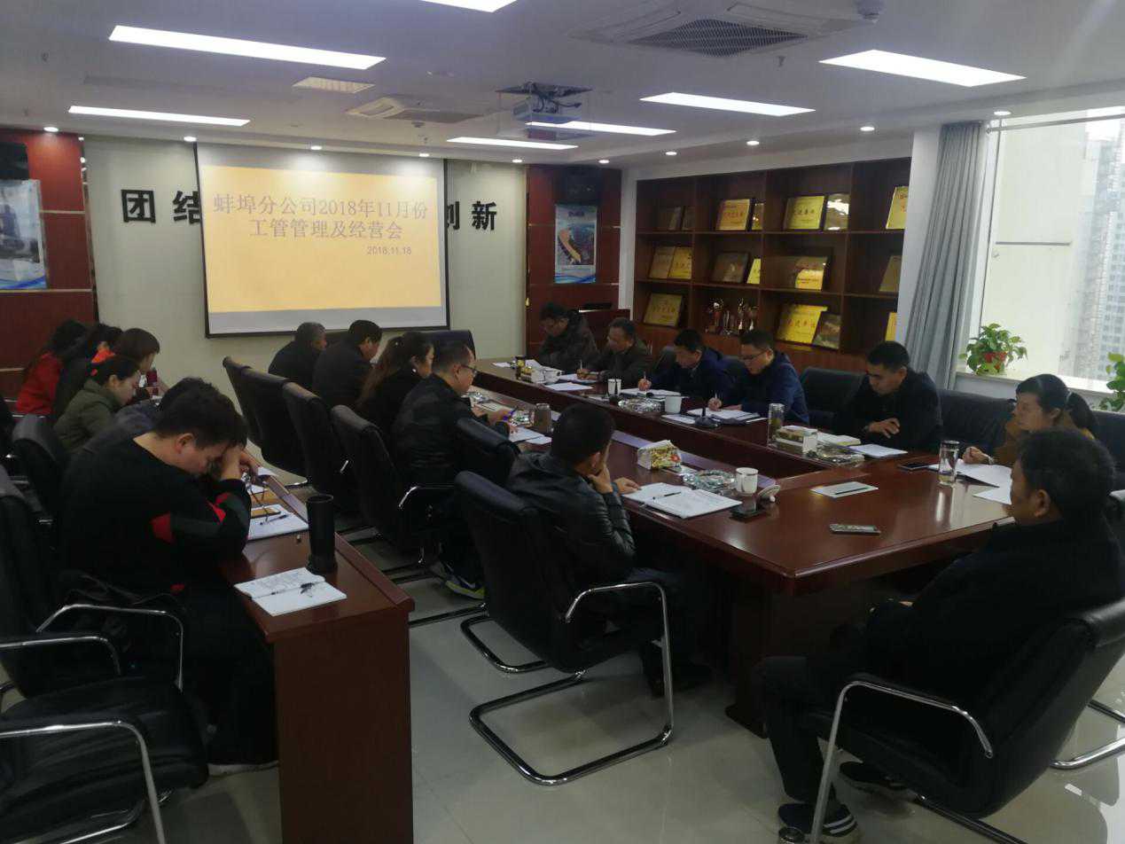 2018年11月18日下午,在蚌埠分公司會議室召開11月份工程管理及經營工作會議。分公司領導班子成員、機關各部門負責人及項目經理、聯營合作單位負責人參加會議,會議由分公司副經理張漢軍主持。