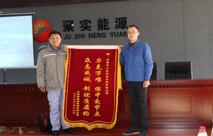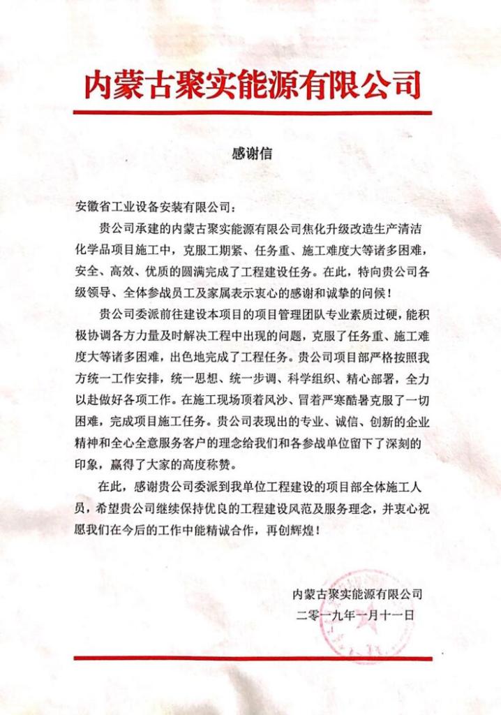 2019年1月14日,安徽安裝承建的內(nèi)蒙古聚實(shí)能源有限公司焦化升級改造生產(chǎn)清潔化學(xué)品項(xiàng)目,克服工期緊、任務(wù)重、施工難度大等諸多困難,安全、高效、優(yōu)質(zhì)的圓滿完成了工程建設(shè)任務(wù)。業(yè)主內(nèi)蒙古聚實(shí)能源公司總經(jīng)理張春軍向公司贈(zèng)送內(nèi)容為“力克萬難 保中交節(jié)點(diǎn);眾志成城 創(chuàng)優(yōu)質(zhì)履約”的錦旗。