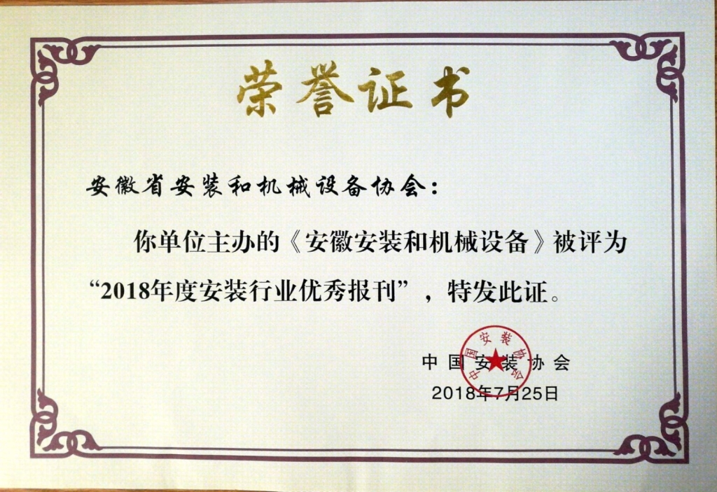 本次評選中,全國共5家行業(yè)協(xié)會獲得“優(yōu)秀期刊”稱號,7家行業(yè)協(xié)會獲得“優(yōu)秀網(wǎng)站” 稱號,協(xié)會主辦刊物《安徽安裝和機械設備》和網(wǎng)站名列其中,報刊主編李鵬飛、杜慶梅獲得“2018年度安裝行業(yè)優(yōu)秀主編”稱號,網(wǎng)站建設者徐俊、黃世碰獲得“2018年度安裝行業(yè)網(wǎng)站建設先進個人”稱號。安徽省工業(yè)設備安裝有限公司等單位獲得“優(yōu)秀網(wǎng)站” 稱號。表彰了先進,發(fā)揚了成績,希望會員單位向獲獎單位學習,認真貫徹落實黨的十九大精神,不斷創(chuàng)新企業(yè)信息宣傳工作,為提升安徽企業(yè)發(fā)展和安裝行業(yè)信息宣傳工作進步做出新的貢獻。