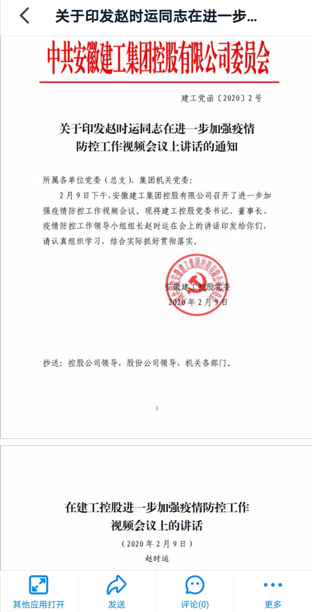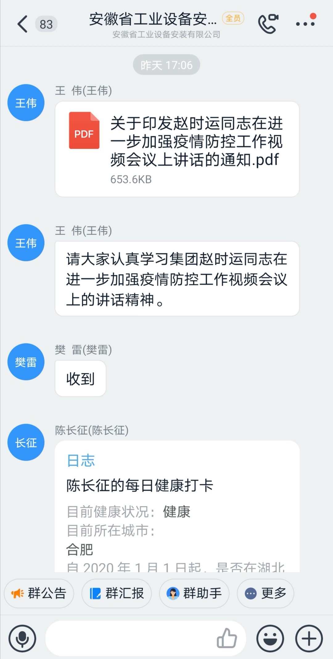 2月11日,安徽安裝公司通過釘釘日志、疫情防控群等網絡形式,迅速將《集團公司黨委書記、董事長趙時運在進一步加強疫情防控工作視頻會議上的講話》精神,傳達到每名職工,做到人人皆知,認真加以貫徹落實。
