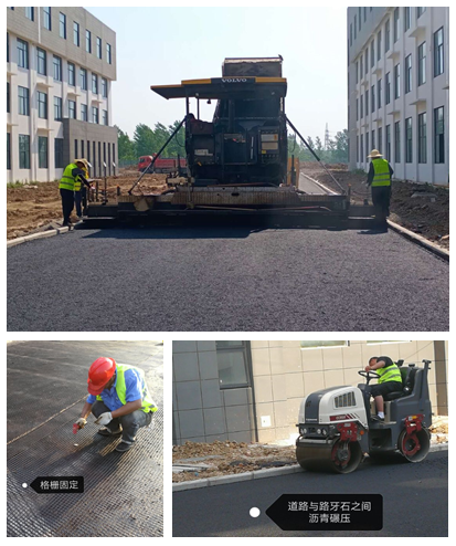 界首出口企業培育基地工程——瀝青混凝土面層攤鋪、格柵固定及路牙石邊瀝青碾壓