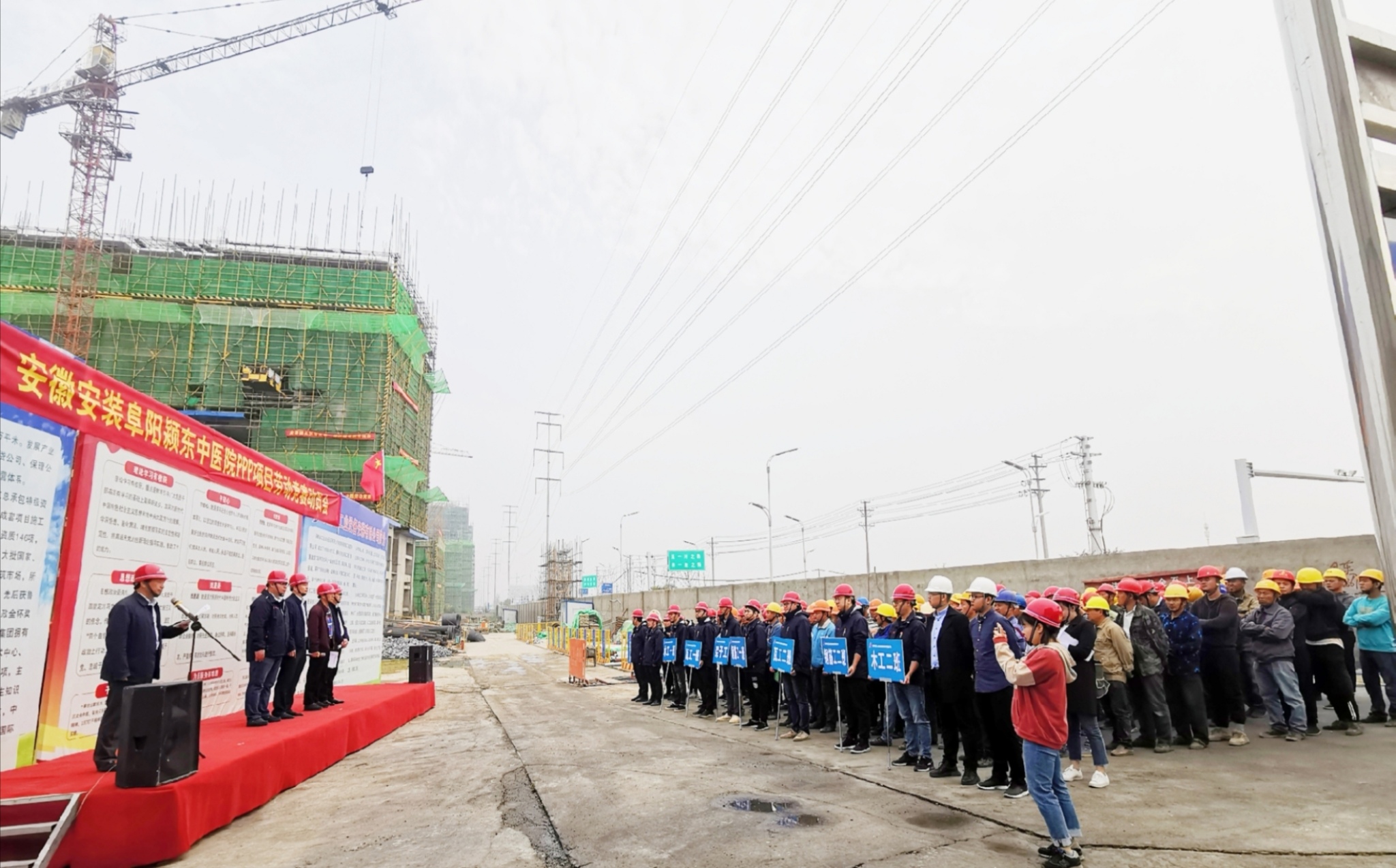 為確保年度各項(xiàng)目目標(biāo)任務(wù)順利完成,貫徹落實(shí)集團(tuán)公司開展“搶進(jìn)度、保工期、穩(wěn)預(yù)期、促提升”為主題勞動(dòng)競賽活動(dòng)精神,2019年10月11日上午,安徽安裝召開阜陽潁東區(qū)中醫(yī)院PPP項(xiàng)目“大干四季度”勞動(dòng)競賽動(dòng)員大會(huì)。公司副總經(jīng)理高飛,紀(jì)委書記、工會(huì)主席李寬旭,總工程師吳繼成,公司相關(guān)部門負(fù)責(zé)人、項(xiàng)目管理人員和施工班組共120多人參加了競賽動(dòng)員會(huì)。
