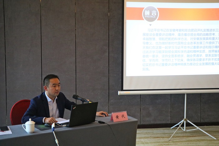 課上,黃代從四個方面宣傳貫徹了習(xí)近平總書記在安徽考察重要講話精神。一是提高政治站位,充分認(rèn)識習(xí)近平總書記考察安徽重要講話指示的重大意義。習(xí)近平總書記考察安徽重要講話指示精辟論述了我省當(dāng)前和未來發(fā)展的一系列方向性、根本性問題,在安徽發(fā)展史上具有極其重大的里程碑意義,習(xí)近平總書記專程視察中國寶武馬鋼集團(tuán)時(shí)發(fā)表的重要講話,也為我們做好國企工作提供了思想武器、指明了前進(jìn)方向、注入了強(qiáng)大動力。全體黨員領(lǐng)導(dǎo)干部要按照省委、省國資委統(tǒng)一要求,堅(jiān)持全面系統(tǒng)學(xué)、融會貫通學(xué)、聯(lián)系實(shí)際學(xué),確保深刻領(lǐng)會重大意義。二是把握核心要義,深刻領(lǐng)會習(xí)近平總書記考察安徽重要講話指示的精神實(shí)質(zhì)。“兩個堅(jiān)持”“兩個更大”,是總書記講話的核心要義,深刻回答了“十四五”乃至今后一個時(shí)期安徽發(fā)展在黨和國家全局中應(yīng)該承擔(dān)的使命、肩負(fù)的任務(wù),將安徽的發(fā)展層次、工作要求提升到前所未有的高度,是當(dāng)前和今后一個時(shí)期引領(lǐng)安徽發(fā)展的總方針、總遵循。三是聚焦重點(diǎn)任務(wù),切實(shí)答好加快美好安徽建設(shè)和集團(tuán)高質(zhì)量發(fā)展的必答題。全體黨員干部職工要深刻領(lǐng)悟全省領(lǐng)導(dǎo)干部“12個必答題”和安徽建工集團(tuán)“10個必答題”,緊扣目標(biāo)要求和各項(xiàng)任務(wù),謀深謀實(shí)貫徹落實(shí)的具體思路、促進(jìn)發(fā)展的實(shí)際舉措、推動工作的保障機(jī)制。四是營造濃厚氛圍,全面掀起學(xué)習(xí)貫徹習(xí)近平總書記考察安徽重要講話熱潮。安徽安裝公司要以“大學(xué)習(xí)”“大宣傳”“大調(diào)研”“大落實(shí)”為抓手,確保對重要講話精神融會貫通、入腦入心、明晰思路、落地見效。