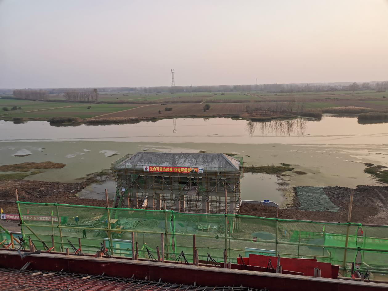 初冬的懷洪新河上,一縷縷的金色陽光灑下,照耀在掄起鐵錘、轉動扳手的施工人員的臉上,驅散了清晨帶來的絲絲寒意,由安徽安裝合肥分公司承建的固鎮化家溝泵站上部結構及附屬工程現場呈現一片忙碌景象。