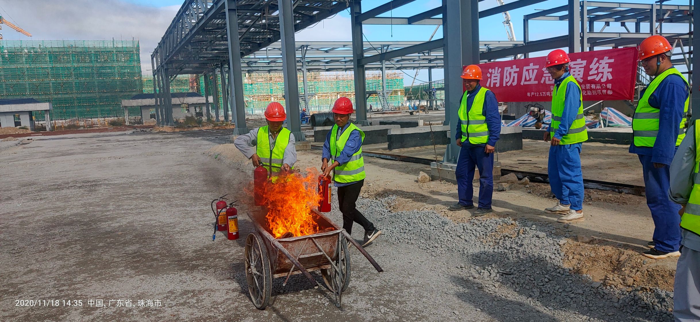 項目安全部負責人皮軍首先介紹了此次應急演練活動開展的相關要求及具體流程,重點對于滅火器材的原理、基本使用方法及相關注意事項進行了說明并親自進行了現場滅火示范操作。通過現場演練,皮軍進一步要求:一是項目部全員要提高思想認識,提高安全防御措施,把“安全責任重于泰山”牢記于心,對于所有動火區域操作按照規范進行。二是要及時進行危險源檢查、辨識、監控工作,夯實各項安全生產,做到安全隱患及時排查與監督。三是項目部要按照“預防為主、防消結合”的方針,加強安全生產法律法規及勞動安全知識的學習,提高應對突發事件的能力。