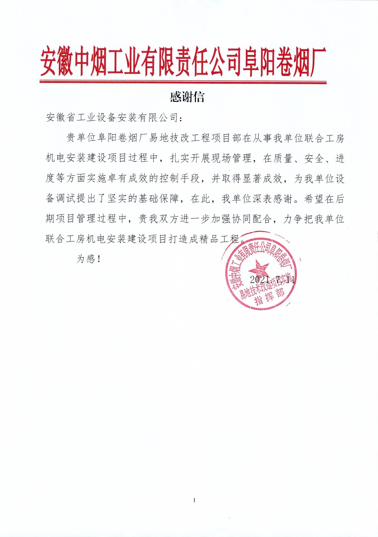 7月11日下午,安徽安裝蚌埠分公司收到安徽中煙阜陽卷煙廠發(fā)來的感謝信。信中對(duì)安徽安裝蚌埠分公司承建的聯(lián)合工房機(jī)電安裝項(xiàng)目表達(dá)了充分認(rèn)可和高度贊譽(yù)。