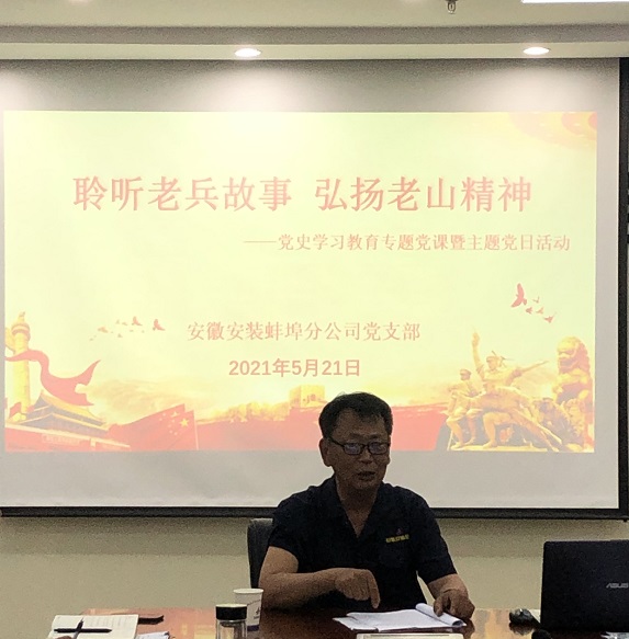 為深入開展黨史學(xué)習(xí)教育活動,進(jìn)一步引導(dǎo)黨員干部學(xué)習(xí)黨史、銘記黨史,5月21日下午,蚌埠分公司黨支部組織開展了一場“聆聽老兵故事 弘揚老山精神”黨史學(xué)習(xí)教育專題黨課暨主題黨日活動。邀請曾參加過對越自衛(wèi)反擊戰(zhàn)的退伍老兵,分公司在職員工年飛同志為大家上了一堂別開生面的黨課。分公司班子成員、項目經(jīng)理、部門負(fù)責(zé)人及全體黨員參會。