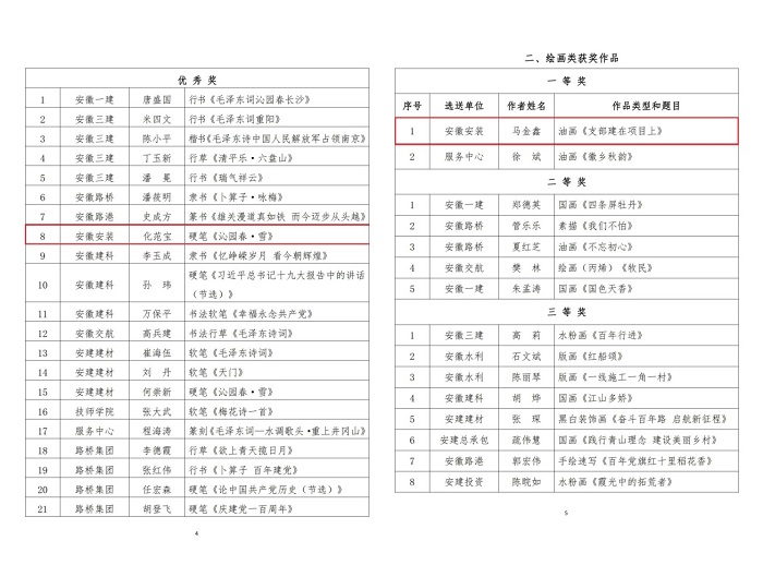 9月29日,集團(tuán)公司工會(huì)通報(bào)了“翰墨寫初心 丹青頌黨恩”職工書畫攝影作品展評(píng)選結(jié)果,安徽安裝公司選送的五幅作品榜上有名。其中馬金鑫的油畫作品《支部建在項(xiàng)目上》榮獲繪畫類一等獎(jiǎng),任禹豪的攝影作品《幸福是干出來(lái)的》榮獲攝影類二等獎(jiǎng),化范寶的硬筆書法作品《沁園春·雪》和程茂麗的攝影作品《攀登》、胡欣欣的攝影作品《齊心》分別榮獲書法類優(yōu)秀獎(jiǎng)和攝影類優(yōu)秀獎(jiǎng)。