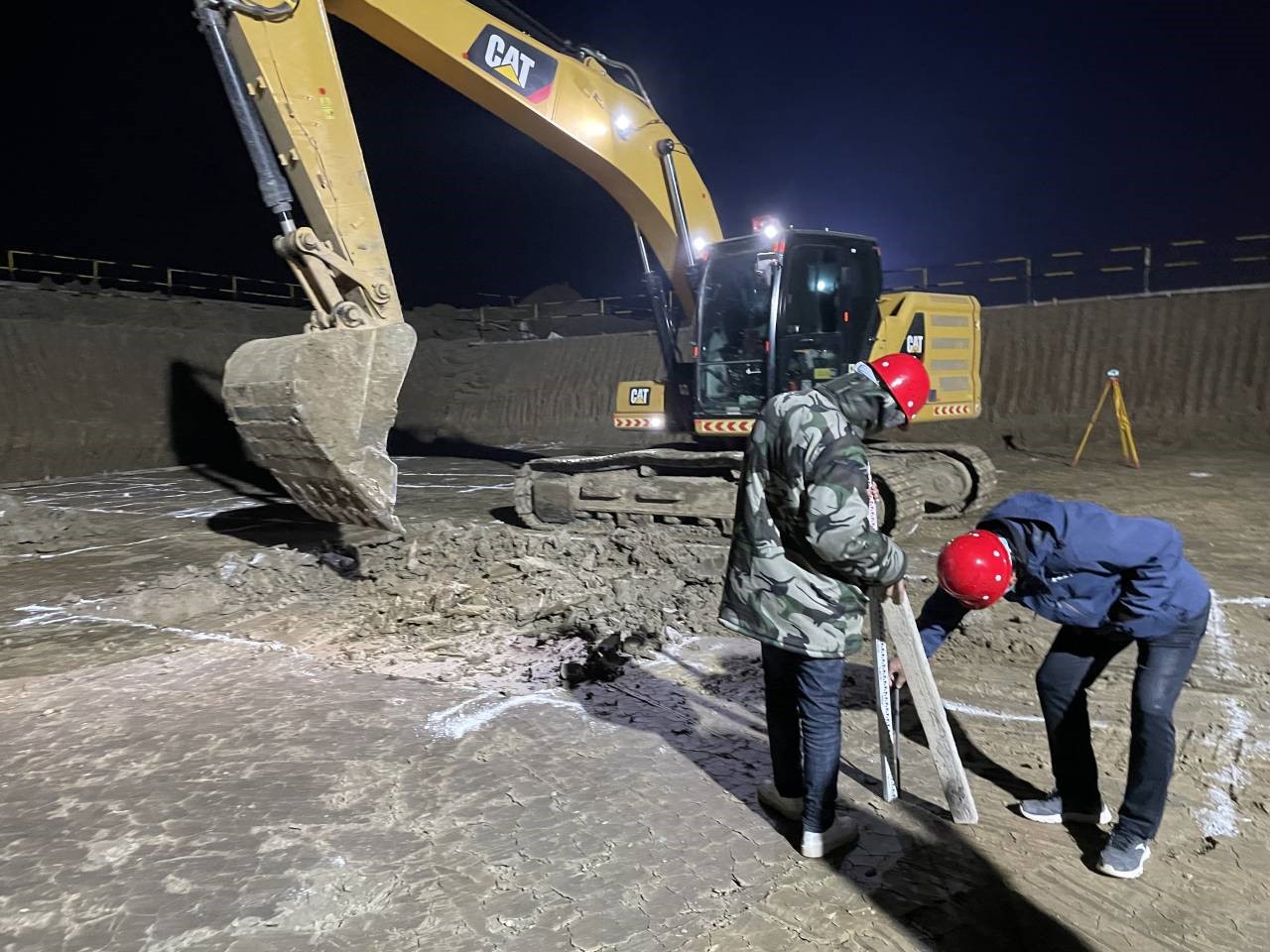 為滿足西動力中心承臺澆筑要求,施工現(xiàn)場燈火通明,項目經(jīng)理徐明東帶領(lǐng)施工員正在認(rèn)真進(jìn)行西動力中心承臺基礎(chǔ)測量復(fù)核工作。