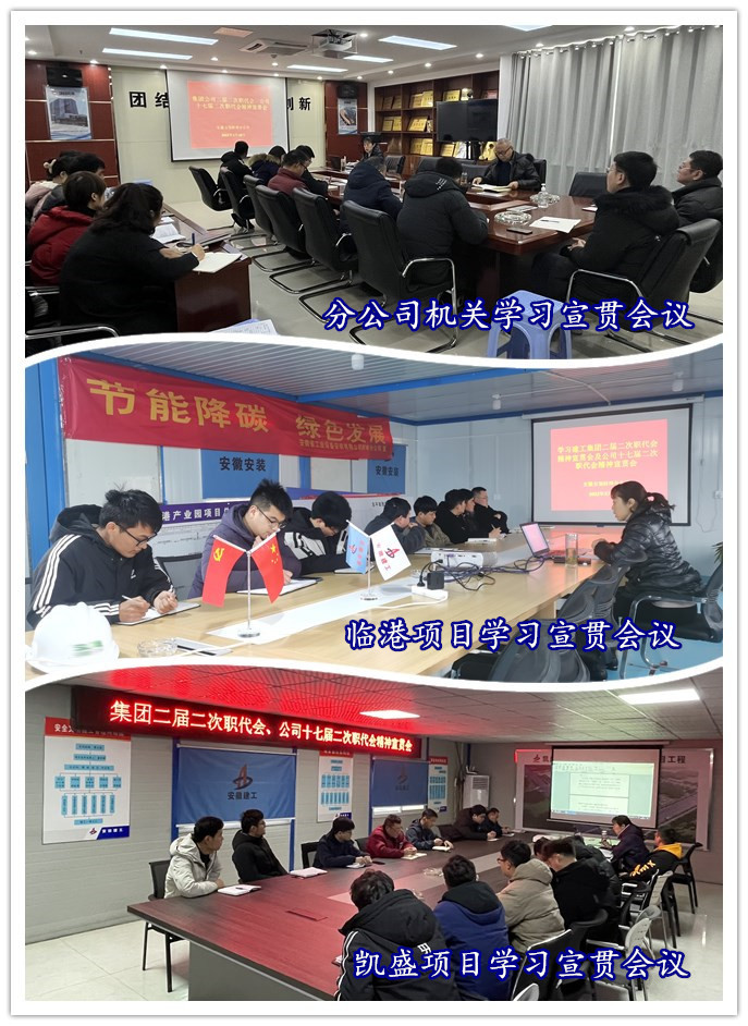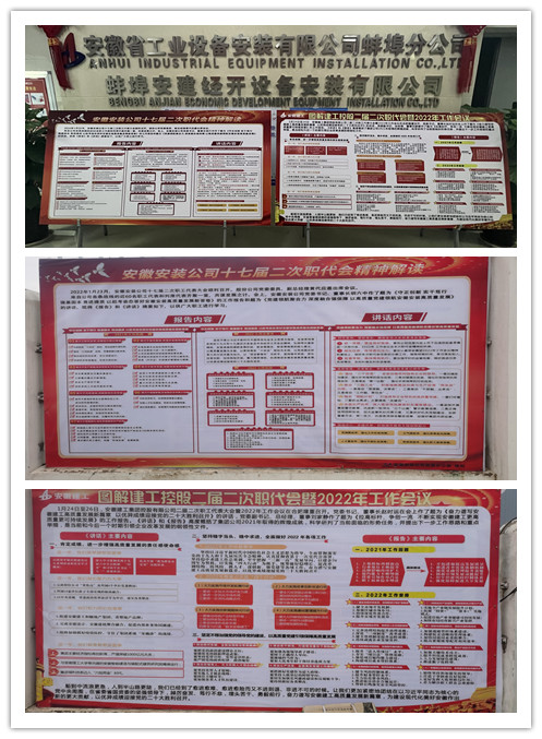 2月10日—11日,在分公司機關和各在建項目一線召開兩級職代會精神專題宣貫會。會議由分公司黨支部書記程茂麗主持。會上,程茂麗首先傳達了集團公司黨委書記、董事長趙時運在集團二屆二次職代會暨2022年度工作會議作的題為《奮力譜寫安徽建工高質量發展新篇章 以優異成績迎接黨的二十大勝利召開》的講話和集團黨委副書記、總經理、董事劉家靜作的題為《拉高標桿、爭創一流 不斷實現安徽建工更高質量更可持續發展》的工作報告;隨后又帶領大家深入解讀了公司黨委書記、董事長胡六中在公司十七屆二次職代會上所作的《守正創新 實干篤行 強基固本 競進提質 以趕考姿態答好安徽安裝高質量發展新答卷》的報告及《黨建領航聚合力 深度融合強保障 以高質量黨建領航安徽安裝高質量發展》的講話。