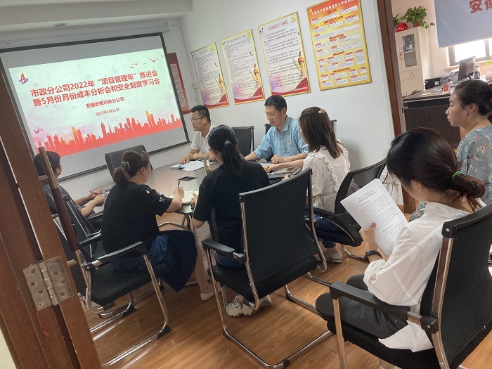為進(jìn)一步推進(jìn)分公司項(xiàng)目管理年活動的開展,5月25日下午市政分公司在分公司會議室召開“項(xiàng)目管理年”推進(jìn)會暨5月份成本分析會議,黨支部書記胡迎東主持會議,分公司機(jī)關(guān)員工、項(xiàng)目員工參加會議,會議以現(xiàn)場加視頻方式召開。