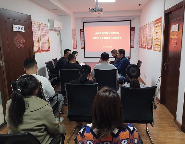 安慶分公司黨支部精心組織及時學。組織全體員工收聽收看黨的二十大開幕會、中共中央介紹解讀黨的二十大報告新聞發布會,通過電視、網絡、廣播等多種渠道及時了解和關注大會盛況,第一時間學習領會黨的二十大精神。組織購買《黨的二十大輔導讀本》、新修改的《中國共產黨章程》學習用書,向黨員干部發放,通過黨員大會、黨員活動日、黨員帶頭領學等形式,為全面深入學習黨的二十大精神,安慶分公司全體黨員領導干部堅持精研細讀黨的二十大報告、黨章等大會文件,全面系統地領會和把握黨的二十大精神,在真學真懂、真悟真用上作好表率、走在前列,帶動全分公司上下迅速掀起學習宣傳貫徹黨的二十大精神熱潮。