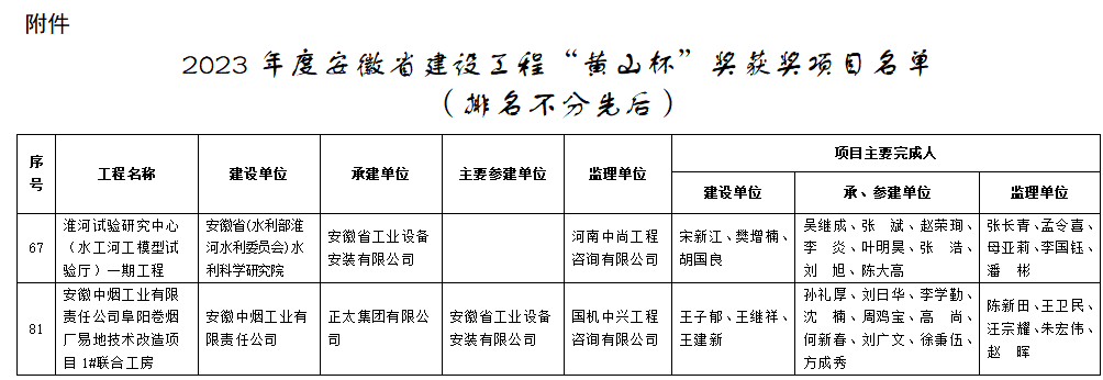 7月25日,安徽省住房和城鄉(xiāng)建設(shè)廳 、安徽省交通運(yùn)輸廳、安徽省水利廳聯(lián)合發(fā)布《關(guān)于公布2023年度安徽省建設(shè)工程“黃山杯”獎獲獎項(xiàng)目名單的通知》,由建工安裝集團(tuán)蚌埠分公司承建的“淮河試驗(yàn)研究中心(水工河工模型試驗(yàn)廳)一期工程”和參建的“安徽中煙工業(yè)有限責(zé)任公司阜陽卷煙廠易地技術(shù)改造項(xiàng)目1#聯(lián)合工房”等2個(gè)項(xiàng)目均獲2023年度安徽省建筑行業(yè)建設(shè)工程質(zhì)量最高榮譽(yù)獎“黃山杯”。其中“淮河試驗(yàn)研究中心(水工河工模型試驗(yàn)廳)一期工程”是建工安裝公司首次作為承建單位獲此殊榮;“安徽中煙工業(yè)有限責(zé)任公司阜陽卷煙廠易地技術(shù)改造項(xiàng)目1#聯(lián)合工房”項(xiàng)目同時(shí)正在申報(bào)國家級安裝行業(yè)最高獎項(xiàng)中國安裝工程優(yōu)質(zhì)獎(安裝之星),5月份預(yù)檢已通過,等待9月復(fù)檢。兩個(gè)項(xiàng)目作為承建和參建單位一舉捧得2樽“黃山杯”,也是蚌埠分公司歷史首次,同時(shí)也是蚌埠分公司近年來捧得的第5、第6樽“黃山杯”獎項(xiàng)。