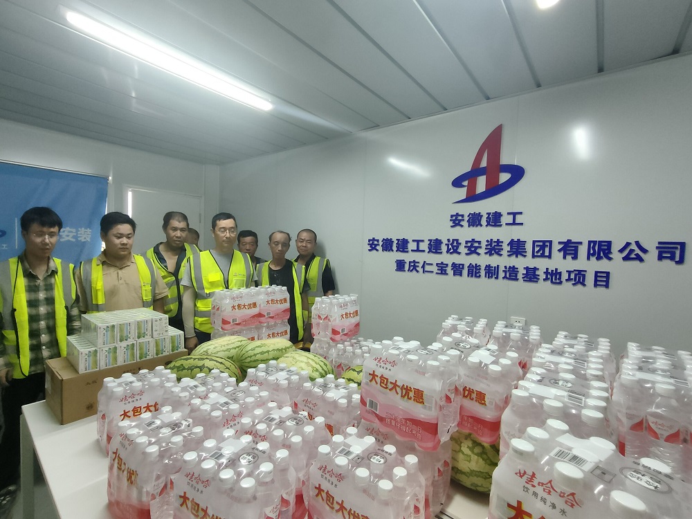 此次慰問先后來到臨湖智能制造產(chǎn)業(yè)園、花園大道、岳西中學(xué)、安徽建工鋼結(jié)構(gòu)綠色智造(六安)、新橋機(jī)場T2航站樓、新橋智能制造產(chǎn)業(yè)園、重慶中冶等項目施工一線,將綠豆、白糖、西瓜、礦泉水、藿香正氣水等防暑降溫物資送到高溫下堅守崗位的一線員工手中。對他們的辛勤付出表示感謝,并反復(fù)叮囑大家要注意防暑降溫,合理安排施工和休息時間,確保施工安全。活動中,項目安全員還對現(xiàn)場工人進(jìn)行了夏季防暑降溫、中暑急救知識宣傳教育,有效提高了大家的自我保護(hù)意識和能力。