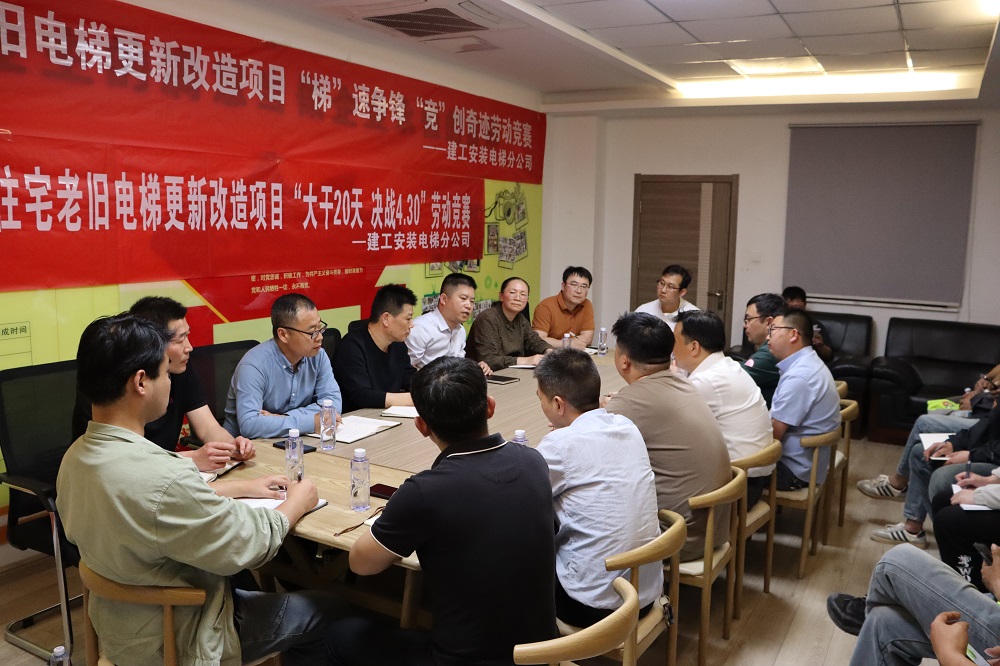 為推動勞動競賽工作的有力開展,進一步激發廣大參建員工立足崗位建新功的勞動激情,推動項目提質增效,順利完成項目目標任務,4月10日下午,建工安裝電梯分公司蚌埠2024年住宅老舊電梯更新改造項目開展了以“大干20天,決戰4.30”為目標的勞動競賽大討論活動。電梯分公司領導班子成員、項目部管理人員、參建單位及勞務班組代表參加會議。