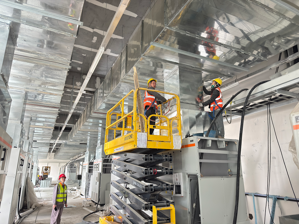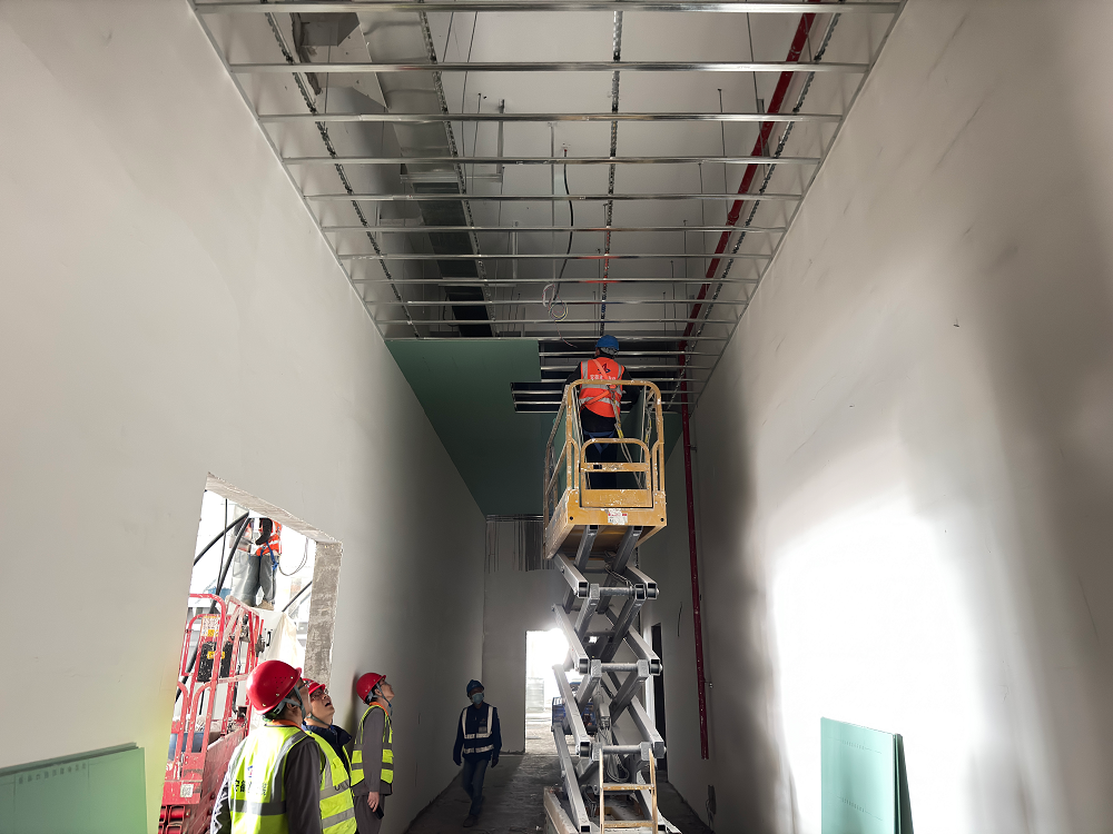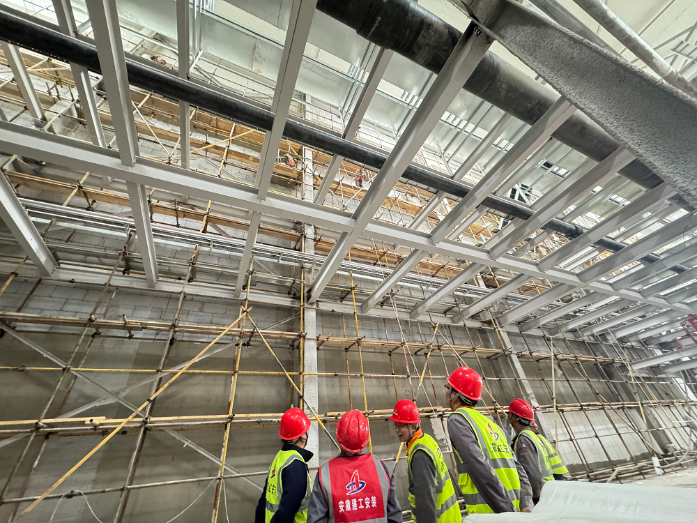 青海高原,氣候惡劣,環(huán)境艱苦,高寒缺氧,但這些困難并沒有阻擋項(xiàng)目部全體成員奮斗的步伐。施工現(xiàn)場(chǎng),機(jī)器轟鳴聲此起彼伏,工人們頭戴安全帽,身系安全繩,操作著各種設(shè)備,熟練地進(jìn)行著防水卷材敷設(shè)、吊頂板安裝、鋼筋綁扎、外墻抹灰、風(fēng)管安裝等作業(yè),每個(gè)環(huán)節(jié)都緊張有序,環(huán)環(huán)相扣。項(xiàng)目管理人員穿梭在各個(gè)施工點(diǎn),緊盯現(xiàn)場(chǎng)安全與質(zhì)量,及時(shí)協(xié)調(diào)解決施工中遇到的問題,他們?nèi)硇牡赝度氲焦ぷ髦校脤I(yè)的素養(yǎng)和嚴(yán)謹(jǐn)?shù)膽B(tài)度為項(xiàng)目建設(shè)保駕護(hù)航。